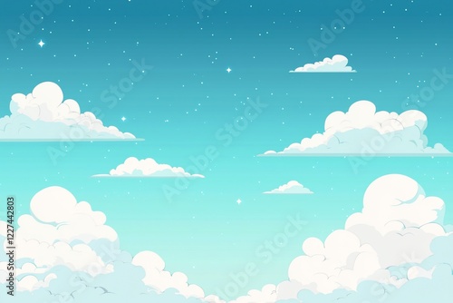 Bright blue sky with fluffy white clouds and twinkling stars, creating a serene atmosphere