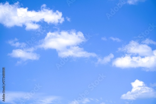Bright blue sky with fluffy white cumulus clouds on a sunny day.
