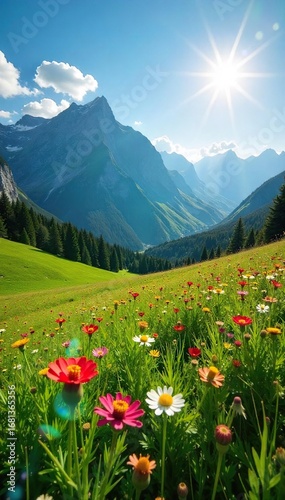 Bright Canadian sun shines on a vibrant green meadow, wildflowers blooming in a picturesque landscape Perfect for travel brochures or nature documentaries , canada, untouched