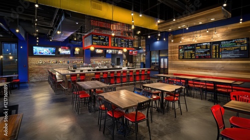 bar, eatery, furniture, table, chair, decor, lighting, atmosphere, interior, design, casual attire, dining, entertainment, sport, food, drink, cookery, menu, wall, screen, vibrant, outdoors, social, airy, modern, urban, gathering, friendly, community, relaxing, inviting, colourful, style, seating, layout, beverage, life events, enjoyment, culinary, hospitality, area, service, environment, leisure, ambience, client