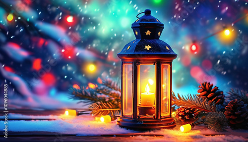 Bright Christmas background, warm candlelight in a winter lantern. Generative AI