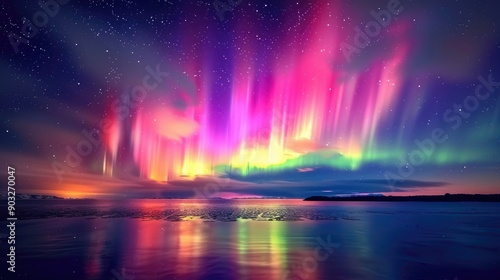 Bright, colorful auroras dancing across the night sky over a tranquil sea