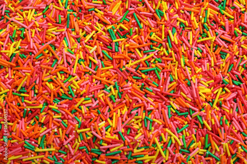 Bright colorful sprinkles as background, top view. Confectionery decor