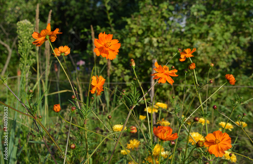 sulfur, cosmos, orange, floral, flower, gardening, garden, countryside, rural, flowerbed, scene, view, russia, country, bright, botany, decorative, day, season, decoration, landscaping, seasonal, design, scenery, sunny day, flora, beautiful, botanical, bloom, natural, field, closeup, background, colourful, colours, yellow, summer, blossom, blooming, fresh, plant, green, nature