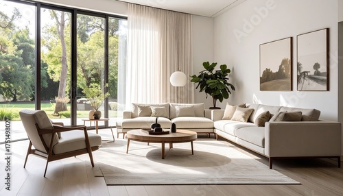 living room, interior design, modern, contemporary, sofa, sectional, armchair, coffee table, rug, decor, furniture, home, house, real estate, architecture, design, elegant, stylish, comfortable, cosy, roomy, bright, daylight, sunlight, natural light, window, curtain, plant, greenery, tree, outdoors, garden, landscape, beige, white, wood, minimalist