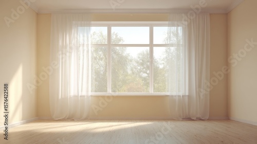 Bright empty room with large window and sheer white curtains in natural sunlight.