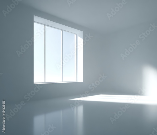 Bright empty room with large window casting soft natural light and shadows on smooth reflective floor, creating calm and spacious atmosphere