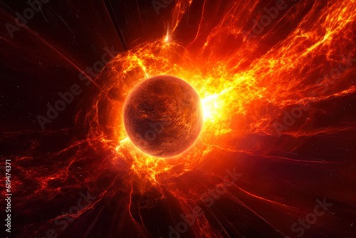 sun, red, planet, bright, fire, space, star, flare, energy, light, hot, cosmos, background, heat, flames, system, science, yellow, solar, power, abstract, sunlight, glowing, fantasy, astronomy, universe, fiery, hydrogen, danger, beautiful, earth, sphere, galaxy, black, plasma, beam, burst, glow, burn, nature, burning, orange, explosion, ai, illustration, generative