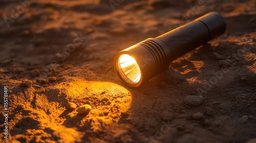 flashlight, light, illumination, dusk, safety, darkness, exploration, adventure, camping, hiking, travel, equipment, tool, nature, survival, shadow, beam, compact, technology, battery, emergency, device, rugged, glowing, bright, night, wilderness, earth, glow, landscape, terrain, portable, shining, warm light, surface, dirt, natural, bright light, object, lighting