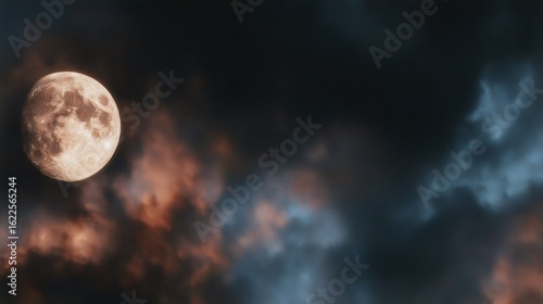 Bright full moon rising in a dark night sky behind colorful clouds creating a dramatic and mysterious atmosphere