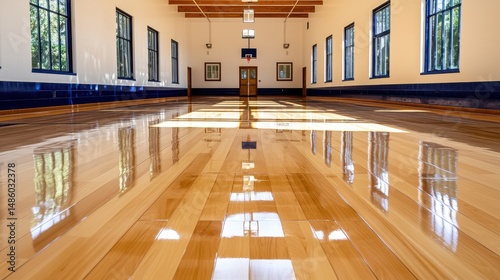 Bright Gymnasium Interior with Polished Light Brown Wood Floor and Sunlight Reflections