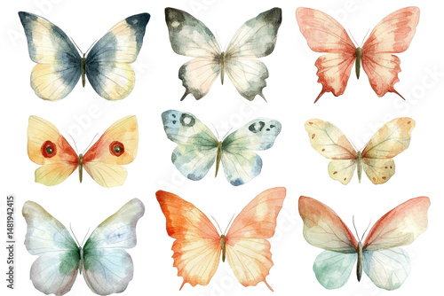Bright hand painted butterfly vector set with watercolor effect isolated on a pure white background