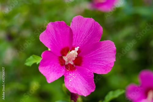 Bright Hibiscus flower blooming in the tropical garden, in soft focus on natural green bokeh background