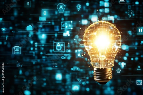 light bulb, digital, idea, technology, innovation, datum, network, stream, blue, glow, bright, abstract, concept, futuristic, background, graphic, design, interface, wireframe, wire, grid, icon, symbol, progress, future, science, inspiration, creativity, cognition, power, energy, communication, connection, cyberspace, web, coding, modern