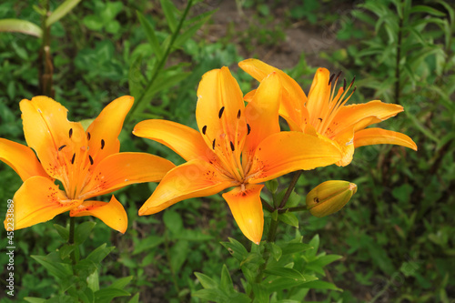 Bright juicy orange lily flowers on a green meadow.