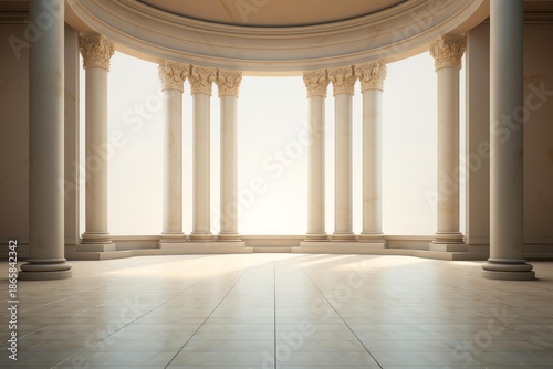 Bright light filling an elegant classical colonnade with ornamental columns and marble flooring