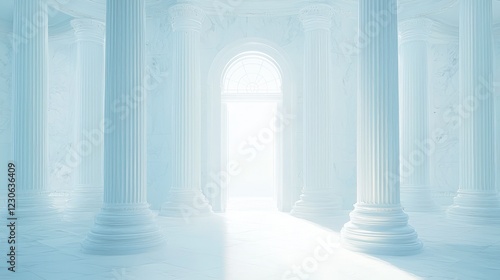 light, architecture, column, hall, doorway, arch, bright, white, marble, classical, ancient, interior, building, room, design, temple, palace, structure, pillar, stone, elegant, grand, majestic, serene, peaceful, calm, clean, pure, glow, sun, ray, shine, aethereal, spiritual, holy, sacred, hope, faith, entrance, passage, way, perspective, background, texture, abstract, three-dimensional, render, illustration