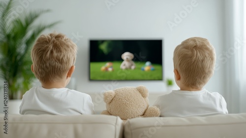 Bright living room scene with children glued to the TV screen surrounded by toys plush animals and snacks light flooding through large windows