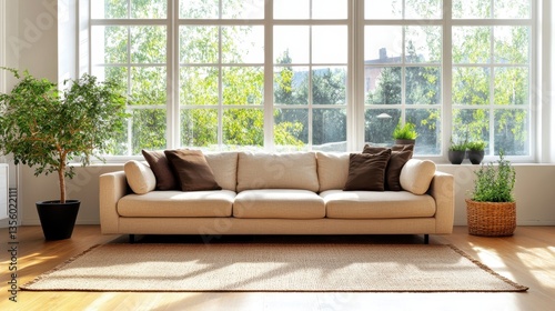 living room, sofa, beige, plant, window, natural light, interior, home decor, cushion, wooden floor, rug, sunlight, greenery, cosy, furniture, room, design, indoor, architecture