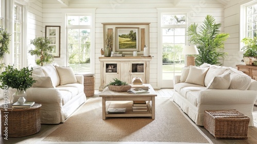 Bright living room with whitewashed walls, natural light, woven rug, and greenery combines charm and calm design