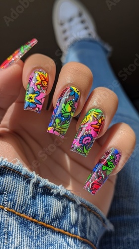 Bright manicure with multicoloured patterns and glitter. Such image will be useful for blogs about fashion and beauty, in social networks to attract attention to the creativity of nail service