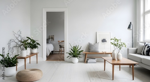 Bright, minimalist living room with white walls, wooden furniture, potted plants, and a view into a bedroom through an open doorway.