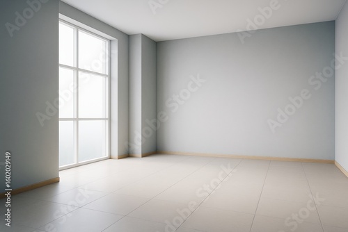 Bright modern empty room interior with large window, tiled floor and soft daylight, ideal for design mockup, branding or architectural template.