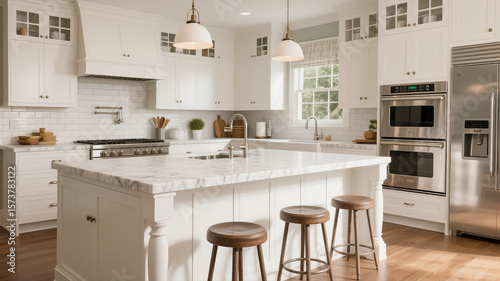kitchen, interior, design, white, cabinet, marble, countertop, island, stool, wooden, modern, home, decor, light, bright, style, domestic, appliance, architecture, furniture, contemporary, luxury, clean, room, window, sink, faucet, oven, refrigerator, stainless, steel, nobody, cooking, space, property, residence, indoor