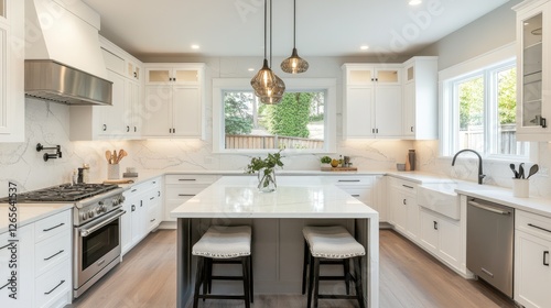 kitchen, white, modern, island, cabinetry, counter, stool, lighting, sink, faucet, dishwasher, oven, stove, hood, backsplash, window, pendant, hardwood, floor, decor, vase, plant, utensil, appliance, interior, design, home, house, apartment, residence, property, architecture, furniture, style, contemporary, clean, bright, roomy, organised, countertop, marble, silver, stainless, steel, wooden, drawer, handle, cupboard