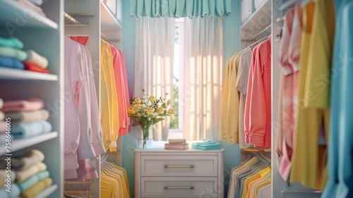 Bright, neatly organized women's walk-in closet with pale turquoise walls and spring flowers. Dresses hanging on racks, knitwear on the shelves. Spring mood in fashion. Stylish summer clothing.