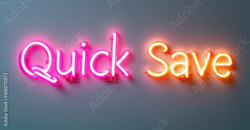 Bright neon sign displays words Quick Save. Pink, orange hues illuminate dark background. Modern design, simple text.