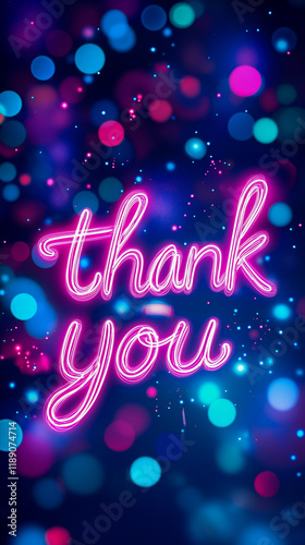 Bright neon "Thank You" text on a vibrant background featuring colorful bokeh lights, ideal for gratitude or celebration themes.