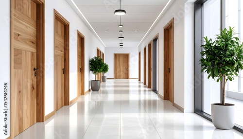 Bright office hallway with wooden doors and white walls, professional workspace design