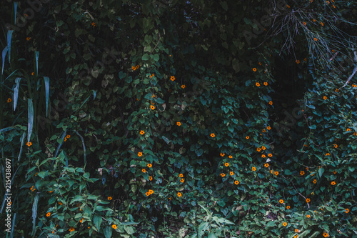 Bright orange Black-Eyed Susan Vine or Clock Vine (Thunbergia alata) flowers growing wild in a thick bush in Ecuador