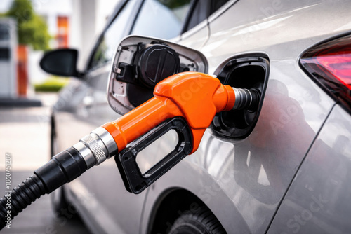 Bright orange fuel nozzle is inserted into a car's gas tank, reflecting the routine moment of refueling at a modern gas station.