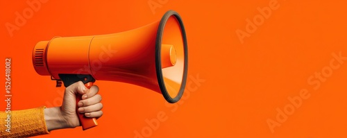 Bright Orange Megaphone Held by Hand Against Vibrant Orange Background Ideal for Attention and Communication Themes