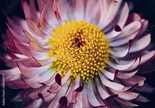 daisy, flower, head, pink, purple, white, yellow, stamen, closeup, black, background, macro, top, view, art, still life, beauty, bright, terry, single, object, sunny, bloom, colourful, blossom, floral, leaf, detail, texture, bokeh, botany, bouquet, colours, composition, creative, decoration, fresh, exotic, garden, plant, isolated, nature, nobody, present, spring, summer, season