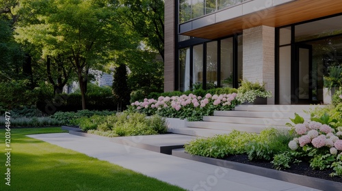 farmhouse, front, yard, hydrangea, landscaping, flower, stone, house, black, window, modern, design, greenery, suppressing, attracted, space, residential, garden, floral, home, architecture, pathway, grass, summer, natural, exterior, warm, colours, tranquil, enchanting, elegant, blooming, living, aesthetic, inviting, contemporary, beautiful, serene, plant, decor, charming, detail, scenic, colourful