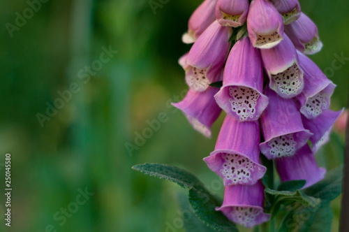 Bright purple foxglove flower close up on a blurred green background.