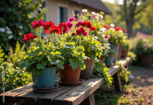 geranium, flower, plant, garden, pot, colourful, red, pink, white, foliage, sunlight, nature, bench, lush, vibrant, blooming, decoration, landscape, scenery, summer, greenery, natural, peaceful, fresh, horticulture, floral, container, growth, environment, calmness, beauty, seasonal, backyard, flora, copy space, space