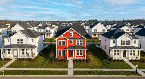 Bright red house stands out among identical white suburban homes symbolizing uniqueness