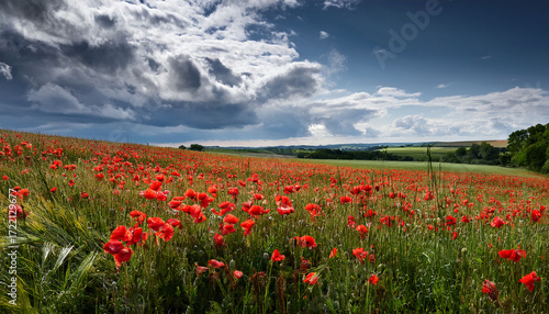 Bright Red Poppies In A Serene Field Under A Cloudy Sky During Late Spring