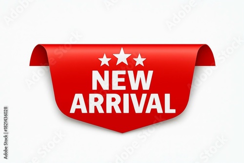 Bright red ribbon tag with three white stars and the text new arrival in white letters