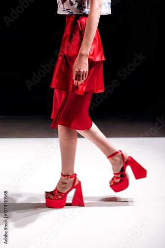 fashion model, runway, fashion show, red, skirt, high heel, modern, outfit, slim, body, walking, shoe, blouse, step, white, fashion, female, background, hand, copy space, design, elegant, collection, cotton, haute couture, fancy, wearing, femininity, fabric, luxury, clothes, textile, detail, fashionable, style, minimalism, posh, wear, lifestyle, trendy, clothes, look, moving, leg