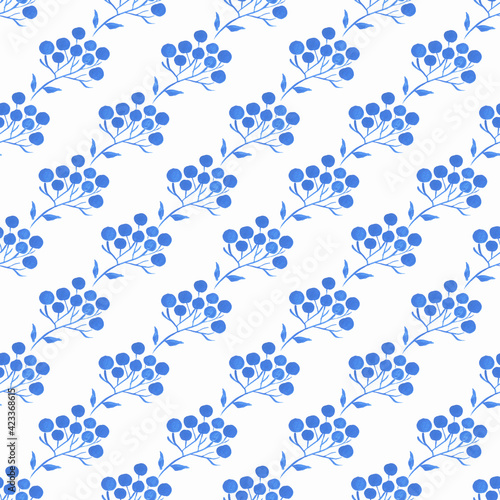 Bright seamless pattern with blue flowers. Texture for wrapping paper, fabric, cards and invitations. Gouache illustration.
