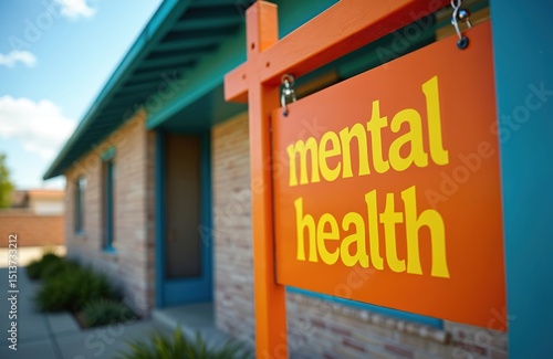 Bright sign displaying Mental Health in front of community center. Focus on mental wellness, awareness programs, support groups. Symbol of mental health care access, counseling services available,