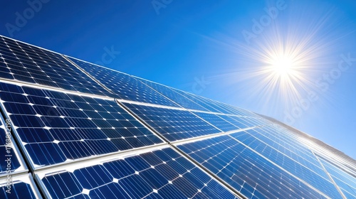 Bright Solar Panel Installation Under Clear Blue Sky with Radiant Sunlight Reflecting on Solar Cells, Renewable Energy Concept for Sustainable Future