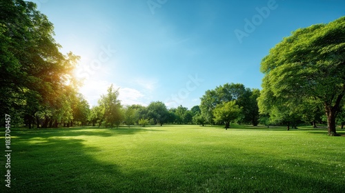 Bright sun over lush green meadow in a park. Nature scenery for outdoor activity, relaxation, fresh air, healthy lifestyle. Beautiful natural landscape.