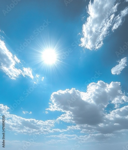 Bright sun shining in a clear blue sky with scattered fluffy clouds creating a serene and uplifting atmosphere