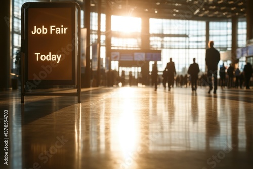 job, fair, sunlight, venue, tied-up, people, event, career, networking, opportunity, interior, modern, professional, gathering, business, signs, employment, atmosphere, space, bustling, excitement, activity, industry, interaction, community, collaboration, entrance, floor, light, shadow, hopeful, engagement, diverse, information, recruitment, background